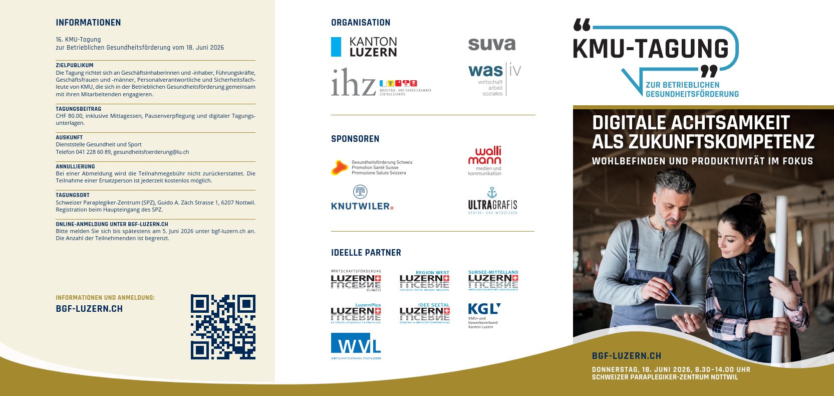 Die KMU-Tagung zur betrieblichen Gesundheitsförderung vom 18. Juni 2026 im Schweizer Paraplegiker-Zentrum Nottwil widmet sich dem Thema «Digitale Achtsamkeit als Zukunftskompetenz – Wohlbefinden und Produktivität im Fokus». Namhafte Expertinnen und Experten geben inspirierende Impulse und stellen praxisnahe Instrumente vor, wie digitale Technologien bewusst, verantwortungsvoll und gesundheitsfördernd eingesetzt werden können. Unternehmen, die digitale Achtsamkeit fördern, stärken nicht nur das Wohlbefinden ihrer Mitarbeitenden, sondern auch ihre Innovationskraft und Wettbewerbsfähigkeit.